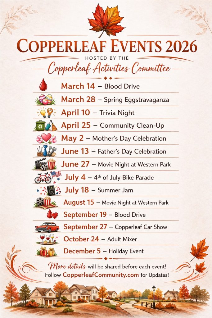 We’re the fun-makers of Copperleaf—planning, promoting, and hosting around many exciting events each year that bring neighbors together and build lasting community spirit. From family-friendly festivals to adult socials, we create something for everyone—while also spotlighting local businesses along the way.